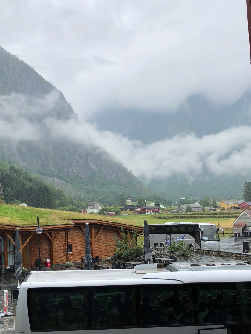 Then we were off to Eidfjord. This little town is at the end of the Hadangerfjord and was so cute. This is a wealthy little region due to the Sysendam which produces a lot of hydroelectric power. All kids between the age of 2-5 are in kindergarten and 70% of kids between 1-2 are in kindergarten. These are all private schools so families need to be able to afford to send the kids. The area also wants to attract more people so it will give you land and 200,000 kroners to build a house. Hydro power in Norway can run 90% of the country. Norwegians use 3X the electric than other Europeans. The dam is made with no concrete, only rocks. Our tour guide’s father worked on the dam and wanted her to make sure we all knew that no concrete was used! Hadangerfjord is the 2nd largest fjord and the longest fjord in Norway. This area also has northern Europe’s highest mountain plateau and hosts about 10,000 reindeer. We didn’t take a lot of pictures because it was rainy and foggy but it was beautiful. Interesting fact: Norway is a “right to roam” country. That means, you can camp anywhere there’s open space but must be 150 meters away from any house or cabin. Everyone is expected to be thoughtful and considerate. Of course, there are other rules but it’s pretty cool that you can just pitch a tent somewhere in the wilderness.